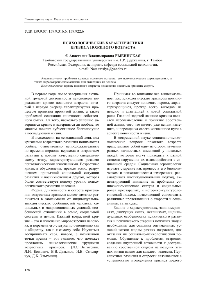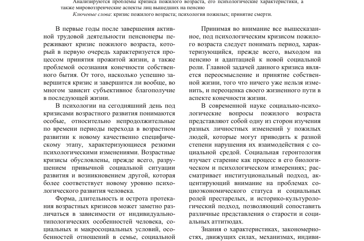 Кризис пожилого возраста представляет собой сложный этап, связанный с пересмотром жизненных ценностей и самооценки. Пожилые люди нередко сталкиваются с внутренними противоречиями и чувством утраты значимости, что связано с уходом на пенсию, снижением социальной активности и изменением привычного образа жизни. В этот период возникают вопросы о смысле жизни, достигнутых целях и грядущем будущем.